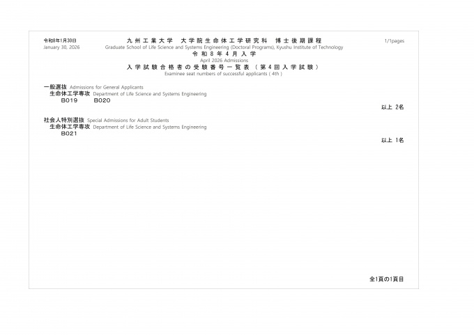 Announcement of Examination Results - Graduate School of Life Science and Systems Engineering (Doctoral Programs) / For Admissions in April 2026